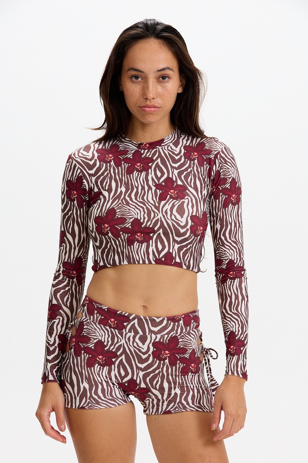 Our new long sleeve top with full frontal coverage, an open back with tie details from the India top, accompanied by our signature Benoa leaf details. This is our go to top when extra sun protection is needed.