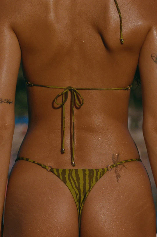 Mary Top in Ganja. Crafted from Italian Vertico fabric - tiger print mix for those jungle-inspired vibes. Featuring tiny silver hoop details and gathered cups in the front, this ‘kini holds you in and offers multiple ways to wear it. Whether you prefer a classic halter or a criss-cross style, the rings allow you to adjust the fit for the perfect look. Match with the Jane Bottom and style with the Riz Short in Ganja. Runs small, we recommend sizing up.